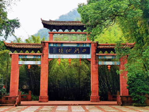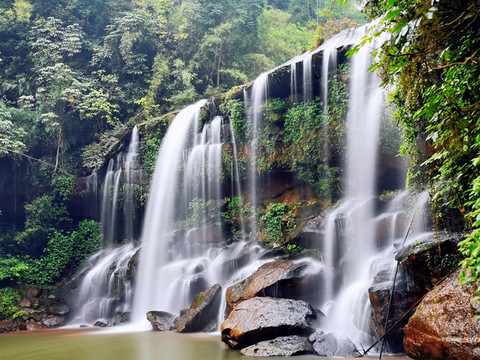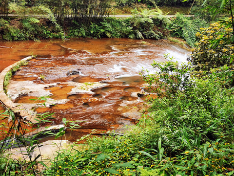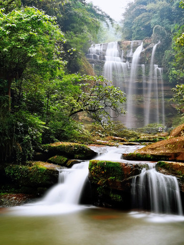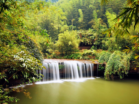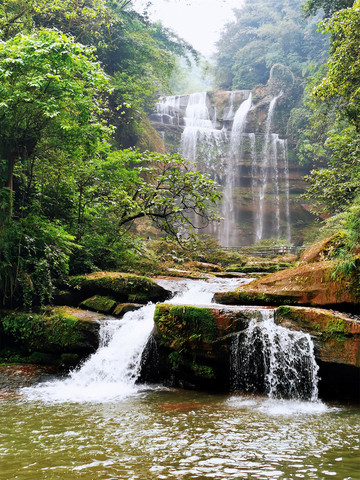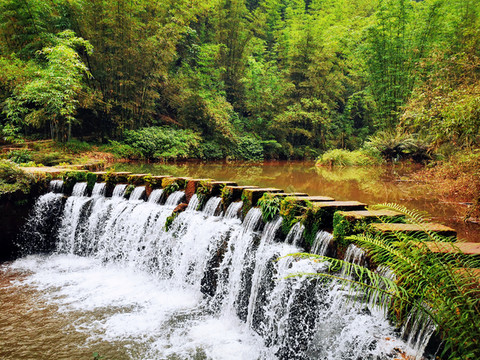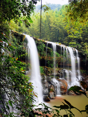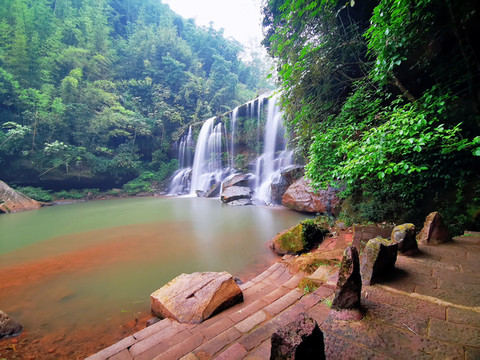 终于开始进入真正的清幽世界,伴随深深浓酽的绿意与凉凉清爽的风,尘嚣人声渐远,有的只是虫鸣泉吟,行在这样的天然氧吧,不知不觉间,脚步慢了下来,身心也变得空灵轻盈,一路前行,溪边奇形怪状的丹霞石星罗棋布,峰媚岭秀,峡谷幽翠,竹林繁茂,绿意醉人,山泉淙淙,虫鸣啾啾,仿若进入仙境……如果说赤水大瀑布震人心魄,那四洞沟瀑布则充满着诗情画意,与大瀑布的震撼相比,四洞沟的溪水与瀑布充满着诗情画意,沿途的竹、树、溪、泉、湖、瀑布无一不让你迷醉,约四公里的山溪间,按大致相等的距离排列着四级跌水瀑布,分别是水帘洞瀑布、月亮潭瀑布、飞蛙崖瀑布、白龙潭瀑布,这四级瀑布瀑宽均在四十米左右,落差高者近五十米,它们形态各异,仪态万方,神韵俱佳,或珠玉垂帘银链高挂,或白龙卧波天河倾侧,难怪被国务院旅游资源考察团称之为“万竹之园”、“小家碧玉”、“没有败笔的景区”。