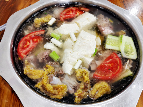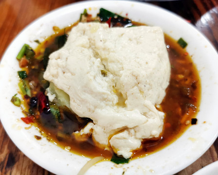 赤水人对豆花情有独钟,复兴农民豆花饭是赤水很有名的豆花火锅,白水豆花每人7元,可免费添加,荤菜在冷柜自由挑选,每斤25元,蘸料蔬菜米饭随便吃管饱,两人一餐吃到撑才40元,真是令人咂舌的“价廉物美”!雪白嫩滑的豆花,鲜嫩绵密,口感细腻,淡香微甜,筷子夹时要小心翼翼,力气稍微大一些就可能夹不起来,配上香辣有味的蘸料,令人开胃冒汗,神清气爽,和米饭绝配,味道让人惊艳,回味无穷,确实有资格自称“农民豆花千万家,好吃只有我一家”。