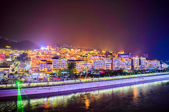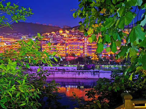 落日西沉,华灯初上,这里的夜景堪称一绝,霓虹闪烁,灯光璀璨,流光溢彩,分外妖娆,让人不禁想起“千与千寻”中的油宫,仿佛穿越到了绝美的漫画世界,仿吊脚楼的设计形成的错落魔幻与神秘感,与重庆洪崖洞有着异曲同工之妙。深深浅浅的巷子,翘角飞檐的民居,在红灯笼的映衬下,仿佛述说着一段段古老的故事,赤水河两岸的建筑,金灿灿的一大片,好像沉浸在酒味中意犹未尽,特别是各大酒厂纷纷将招牌扎堆竖立在1915广场对岸,争夺广场上的眼球。