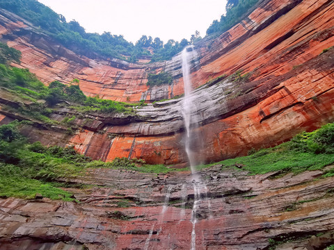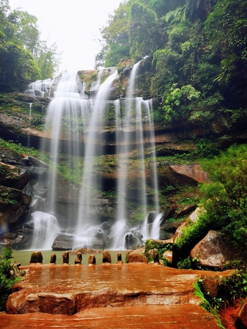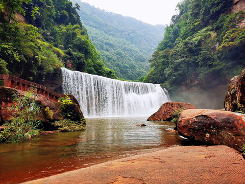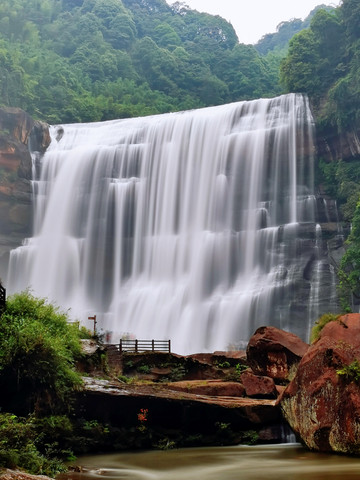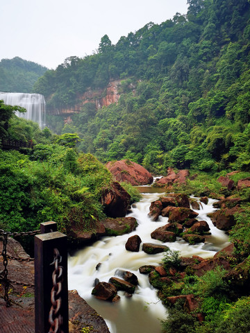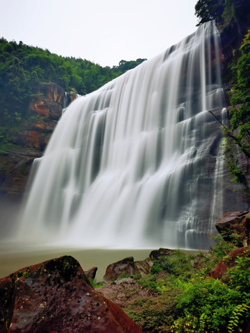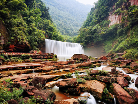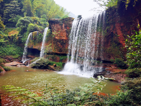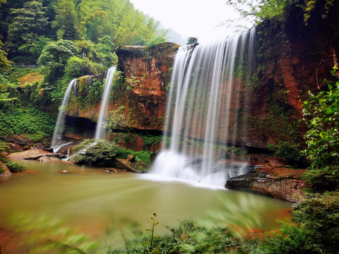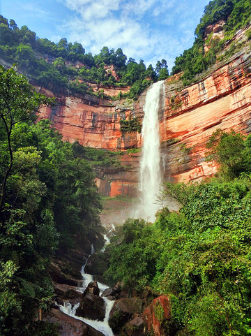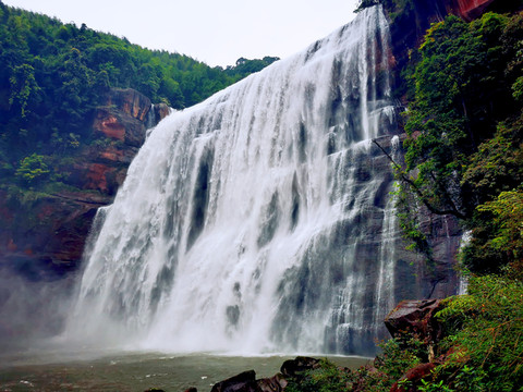赤水大瀑布(原名十丈洞瀑布),高76米,宽80米,其规模仅次于黄果树瀑布,是中国最大的丹霞瀑布,也是我国长江流域最大的瀑布。几里之外就能听到先声夺人的瀑布雄浑轰鸣声,坐观光车到瀑布上方,步行沿栈道下到谷底,只见气势磅礴的大瀑布从悬崖峭壁上一泻而下,百米内水雾弥漫,越往前走,浓密的水雾越径直扑面而来,几乎瞬间就要湿身,无论怎样的语言都难以描绘其壮美,相比黄果树大瀑布,赤水大瀑布更适合近距离接触,直接走到瀑布底端,从下九十度仰望瀑布才是真正的震撼。
