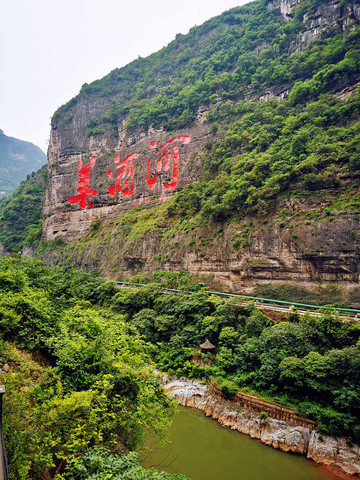沿着赤水河往茅台方向一路前行,经过整条河谷最为险恶的吴公岩,这里两山对峙,壁立千仞,一水争流,动地惊天,“美酒河”三字就镶嵌在吴公岩三百米高如刀削的悬岩陡壁上,面积约为四千八百平方米,由著名书法家邵华泽题写,红色的书法与粗糙的山体交相辉映,苍劲有力,气势恢弘,被载入大世界基尼斯之最,无论是整个摩崖还是单个石刻汉字,均是世界之最。