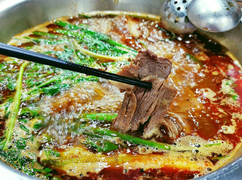 入夜了,闺蜜的遵义同学邀请我们去品尝最正宗地道的麻羊红汤火锅,黔北麻羊,肉质鲜美香嫩,无膻味,是山羊中的极品羊品种,食用生鲜灌木中草药,饮用富含天然矿物质泉水,野外活动都是在陡峭山岩石中,以体态健美而享誉美食界,本就膻味淡肉质香,再经特殊烹饪处理,刚刚出锅的麻羊汤锅,四溢着飘香的味道,汤汁鲜淳红亮,辣香味浓,油而不腻,先从品汤开始,撇开红油,盛上一碗热乎乎的羊肉汤,品上一口,那满口的鲜味,让味蕾尽情地体验着极致的美味,再夹一块羊肉往蘸水里一蘸,放在嘴里细腻绵软,肉的香味似乎调动着每一根兴奋的神经,口口爽滑。
