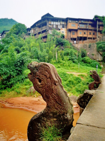 丙安古镇,一个由千根柱子撑起的古镇,临崖而建,距今已有近千年历史,被专家学者誉为“明清建筑与历史的活化石”,具有“千年军商古城堡”之美誉,是当年川盐入黔的重要驿站,1935年红一军团长林彪率部攻下丙安后,曾将军团指挥部和红二师师部设于丙安古镇,后奉命率部回师土城,保证了红军顺利一渡赤水。我们步行从丙安纤道经双龙桥进入古镇,镇头的双龙桥始建于清代,呈东西走向,桥面分为九段,中间两礅凿有一雌一雄两条龙昂首朝向上游方向,石龙与桥墩浑然一体,桥中间另外三墩上有被破坏的雕刻痕迹,据附近居民讲是狮子造型。丙安古镇拥有保存完好的吊脚楼群、古寨门、石板街、摩崖石刻等,贯穿古镇的一条街名为葫芦街,最窄处不足两米,像一个倒挂的葫芦形,东华门是口,太平门是底,象征着赤水河带来的财富,源源不断的汇入古镇。