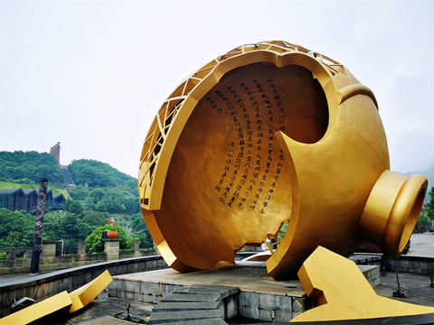 告别茅台镇,驾车前往茅台机场,途径国酒门,端庄威严,旁边就是巨型茅台酒瓶,用钢筋水泥铸造,瓶体通高31.25米,直径10.20米,体积1469.33立方米,能容纳500毫升装的茅台酒2938660瓶,按茅台酒厂官方指导价1499元计算,能装入价值44亿元的茅台酒,人称 “天下第一瓶”,1997年上海大世界吉尼斯总部授予这个巨大的茅台酒瓶为:世界上最大的实物广告。“天下第一瓶”,左侧俯瞰盐津河大峡谷,右侧与国酒门相呼应,高耸入云霄,一览众山小,它既体现了国酒之乡的主要标志,又寓意了茅台酒至尊的显赫地位,但是它已经在此矗立了二十多年,亦已显得非常老旧,也就不那么高大伟岸了。