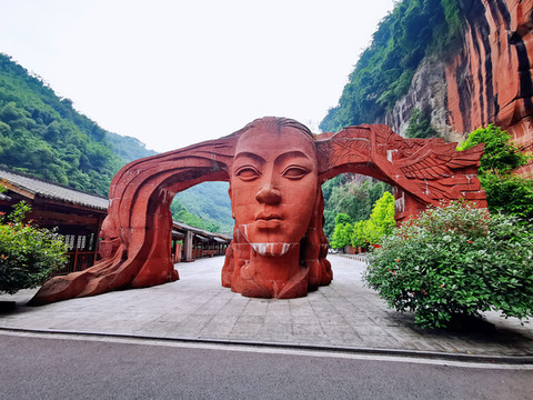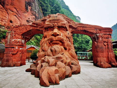 赤水大瀑布大门内外两尊塑像,全部采用赤水丹霞石雕凿砌建,正面长髯老人头像雕塑,喻指“森林老人”,背面美女头像雕塑,取材于画家刘海粟大师为大瀑布题词“空谷佳人”,头像雕塑与四周丹霞地貌、绿色森林互为映衬,极具特色。