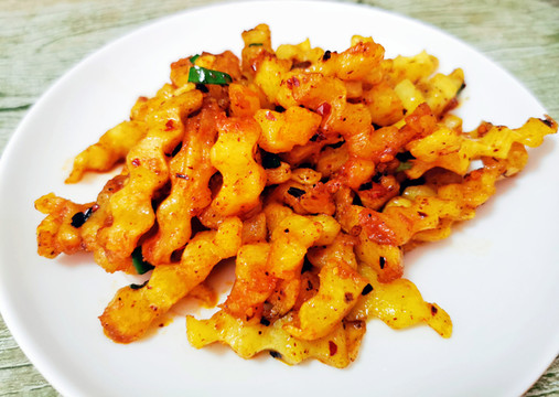 作为遵义人心中的火辣女神,刘二妈在红油米皮界的神坛地位是不可动摇的,刘二妈米皮,步行街上的人气店铺,店面很袖珍,很多人直接捧着碗在街边大快朵颐,雪白的米皮滑糯有嚼劲,鲜红的油辣椒很带劲,再加上炒得喷香的肉丁哨子,配上几粒花生、一把香葱,绝对色香味俱全。