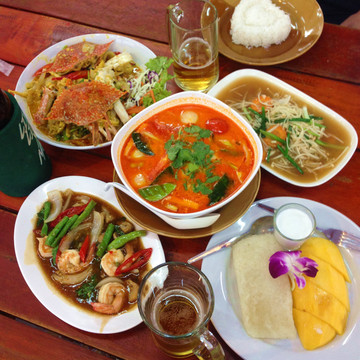 吃:泰菜口味偏重,咖喱是最主要的调料。相比日料、韩料,我还是比较喜欢泰菜的,但是跟中餐还是没法比的,泰菜烧法比较单一,没有中餐的烧法如此博大精深。但初来泰国的第一餐,感觉还是棒棒哒,其中咖喱蟹、蒜泥龙虾、芒果捞饭最爱,冬阴功汤的味道酸酸辣辣的,有点吃不习惯。泰国水果很多,有很多都叫不上名字,其中小菠萝最有印象,长得比苹果还小,看着很Q。泰国随处可见7-11超市,里面有一种香焦牛奶饮料味道不错(也是攻略里看到的)。普吉还有个出名的班扎恩海鲜市场,楼下卖海鲜,楼上代加工,跟三亚的春园差不多,据说那里海鲜很不错,可惜没去成。