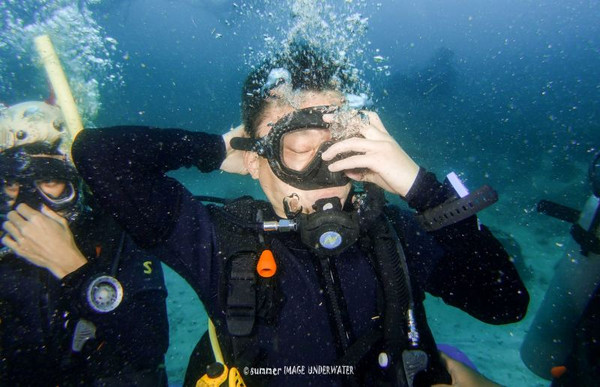 其实,对潜水员心理承受能力最大的挑战是面镜排水和呼吸管排水,因为稍有不慎海水可能会进入鼻子、眼睛,比较难受。如果在比较深的地方呛水或者面镜入水,是没有办法立即上升到水面处理的,所有意外情况的处理必须在水中完成,这就要求潜水员有很强的心里素质,关键的关键是不要慌,一旦慌张很容易出现失误导致呛水。其实只要按照泳池里练习的方法完全可以做到万无一失。