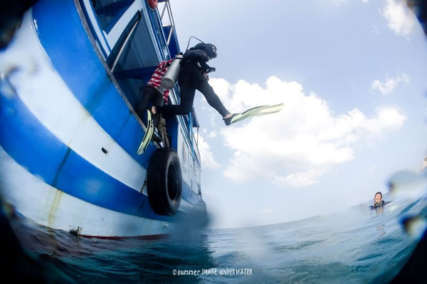一切检查妥当,左手按在腹部的配重上,右手手掌按住呼吸头、食指中指按住面镜,依次排队步入式跳入海中,从近2米高的船舷上跳入大海还是有些害怕,头几次动作变形,几次以后心里有底了,才逐渐放松。看看我这张步入式入海是不是很帅,右下角是我们的教练AK。