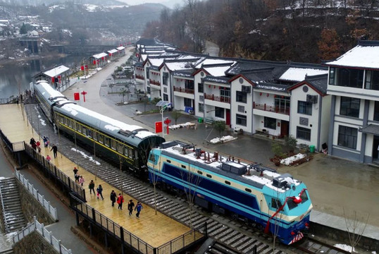 铁路小镇的建设得益于国铁集团捐赠的资源,1台机车、2节车厢以及信号机、铁轨、轮饼、枕木等铁路报废物资设备。退役多年的火车头和列车车厢,经过精心改造,变成咖啡厅和宾馆。机车车头、列车车厢、铁轨、枕木、车轮,随处可见的铁路景观,走入其中,不仅可以感受到大自然带来的静谧,还可以感受到浓郁的铁路文化。