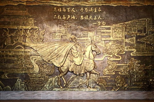 太白堂四周的汉白玉浮雕艺术墙,共计293平方米,由 22 块画面拼接而成,每块高8.3米,宽1.65 米。李白一生广游名山,足迹遍及大江南北。浮雕墙按东南西北的方位,以代表性符号浓缩了中国名山,每幅浮雕相对独立,却又相互关联,逶迤不绝。