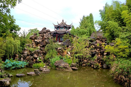 柚香园是典型的中式园林构建,中间有水,一个占地约十亩的池塘位于中间。