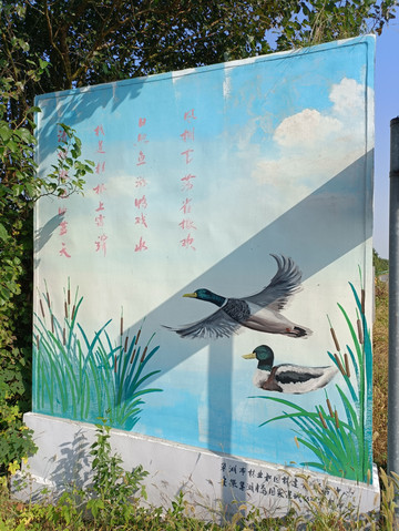 清水澈池映蓝天,栈道拦桥上霭端。日照鱼游鸭戏水,风拥苇荡雀撒欢