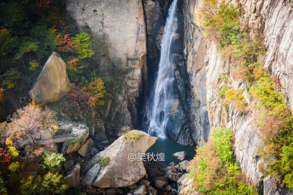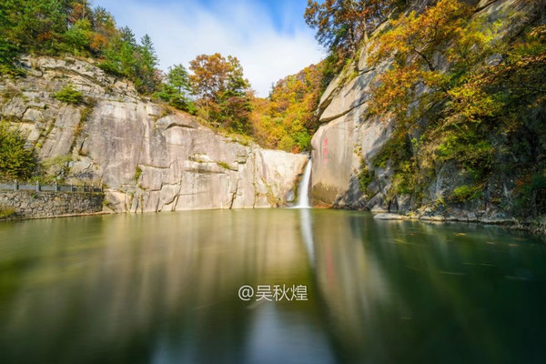 九龙瀑布,石壁上天然形成九条龙身岩纹,形似九条巨龙,故得名。秋天来这里,瀑布的水是并不是很大,但依然能感受到九龙瀑布奔泻的壮丽的峡谷奇观。