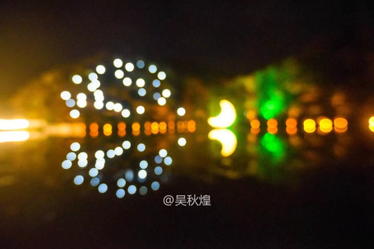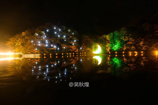 白云湖夜景,月亮像倒挂在湖水中一样,我喜欢迷离的夜色,有着安静的味道,五颜六色的光影在水波间构成生动的色调。