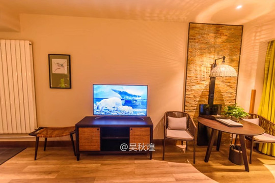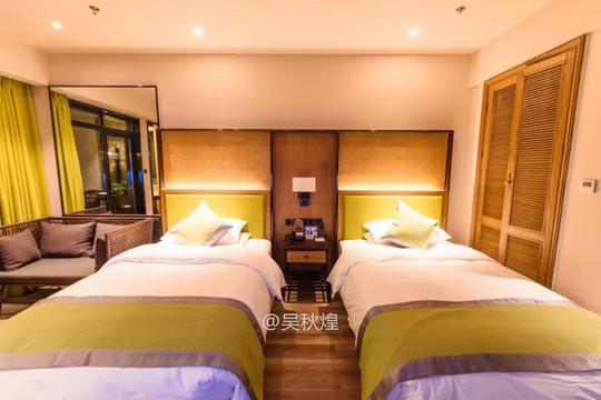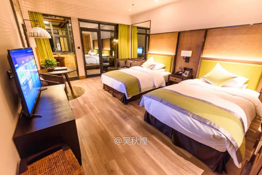 房间设计得很大气,风格为园林庭院式山体度假酒店,身心放松,远离城市的喧嚣,暖暖的色调。白云人家度假酒店是瑞贝卡旗下的一家酒店,说到瑞贝卡女生一定很了解,它是假发的大牌,范冰冰的假发就是出自瑞贝卡之手。
