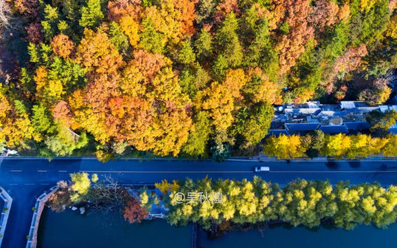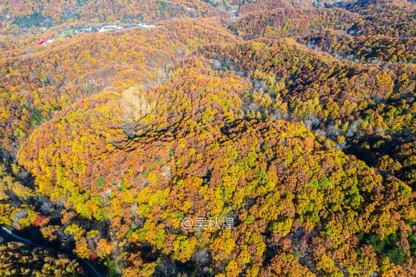 秋日航拍是一场视觉盛宴,入目都是温暖的颜色,房屋、公路都成了点缀,这是一个色彩斑斓的季节。