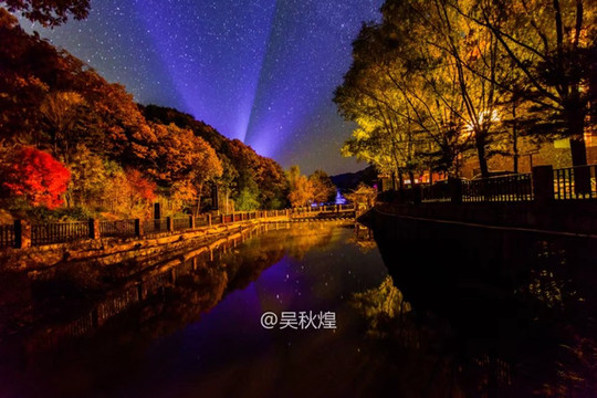 月明星稀,可今晚月亮在地上,在湖里,并没有抢了星星的光芒,而金黄的树叶衬的蓝天更美,星星更明亮。