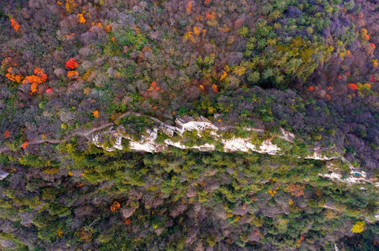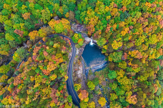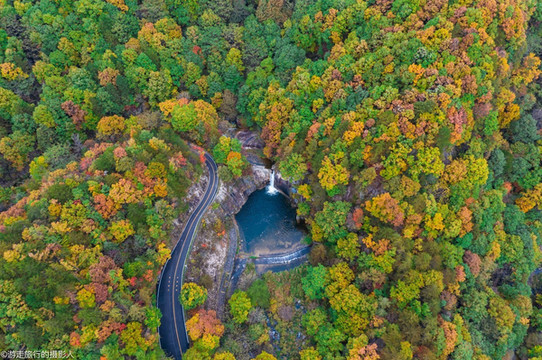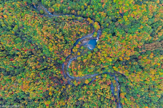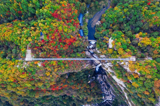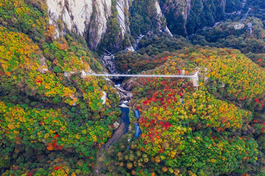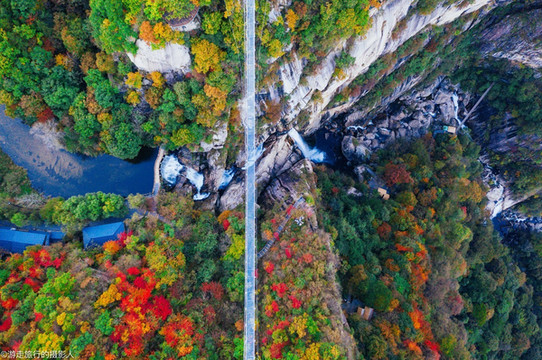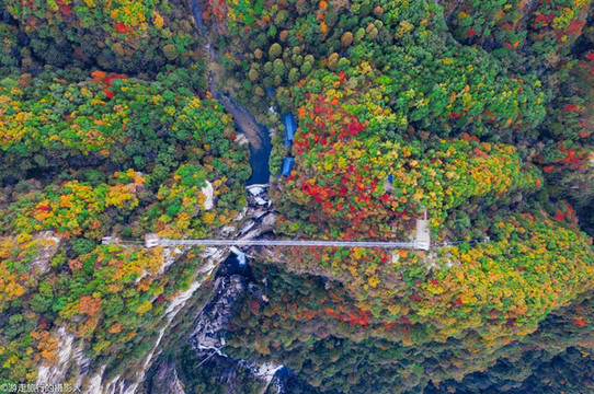 放飞无人机俯瞰整个九龙大峡谷和天桥,下面全是五彩斑斓的色彩,仿佛是上帝打翻了染色盘,你绝想不到,这么小小的山谷在秋日里竟然如此千娇百媚。