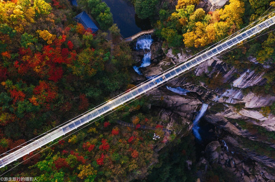 我们乘坐景区电瓶车到达九龙瀑布停车场,我们先来游玩的是九龙天桥和悬空玻璃栈道。我17年来的时候九龙天桥还没有建,那个时候去玻璃栈道是直接走步梯走过去的,现在有了九龙天桥,想体验的可以玩一下,从九龙天桥走到对面的山上。