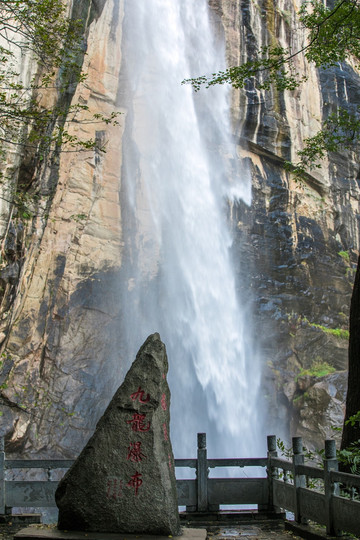 在落差达300余米的“千尺崖”下,九龙瀑布上与蓝天白云相接,下与碧潭深渊相连,那奔腾的气势,仿佛银河倒泻。