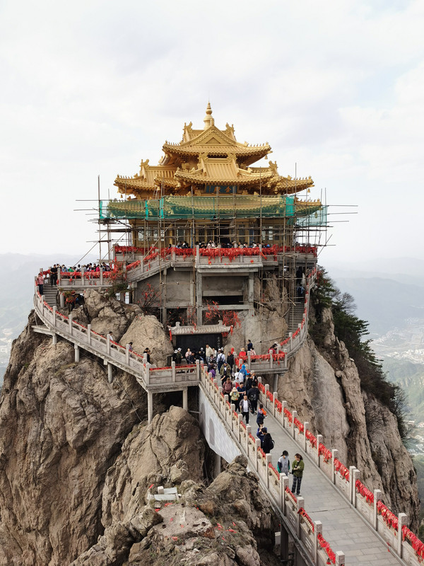 虽然提前预定了,但是计划赶不上变化。原本预定的晚出发看夜景团,结果导游通知当天人员爆满了,所以要提前一个半小时到8点半集合,我早上本来预计去看牡丹花的计划就只能取消了。当天预计单程缆车排队要1小时以上,不过还好我们到的比较晚,基本排了不到半小时,一路上感觉走走停停,个别地方确实很堵,登山一定要注意安全距离。老君山亮灯时间17点40到18点40,但是现在天很亮,照片里面都看不出来,另外我们去的时候金顶在维修,所以拍照效果很一般。建议大家亮灯以后拍几张照就赶紧下山,这样第一程索道时候基本不排队。山顶温差大,我们到的时候大概5点左右,我穿了冲锋衣,贴了3个暖宝宝都没感觉,到山下才感觉到烫。山顶也没有不透风的可以供休息的地方,所以建议大家安排好时间,不要在山顶等太久,真的容易着凉。