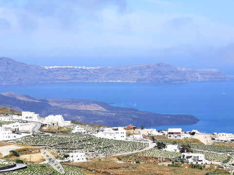 最左侧是阿克罗蒂里角(Akrotiri),丘陵上种植着大片葡萄园地。白色房屋散落其间。