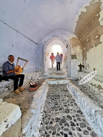 一条地道式走廊里有位当地人在弹奏里拉琴(Lyra),那声音有点类似木吉他。古希腊黄金时代的游吟诗人总是喜欢边弹里拉琴边吟唱。里拉琴起先只用来伴唱,到后来才成为独奏乐器。