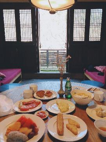 早上起来,推开门,青山绿水,蓝天白云,预约了8点半早餐送到房间内,很准时,依旧是中西式早餐,但品种却不重样,Casper咕咚咕咚的吃下一碗热腾腾的面,要开始新的一天了。