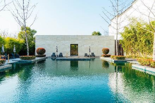 沿着小路前行,是兰亭的水疗与活动中心,湛蓝的泳池将白墙黑瓦倒影其中,若是夏天来,这里定是嬉水的好去处。