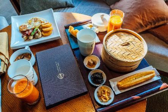 早上起来,提前预约了早餐送到房间内,一份中式,一份西式,满足我和老薛不同的中西胃~
