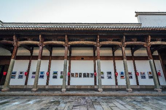 步入首进天井,便是开启了一段穿越古今的大雅之旅。两侧廊道挂满了小红灯笼,寓意着祥和,墙上是正在举办的摄影展,虽然是现代作品,但或许同为艺术品,融入在这老宅中竟也相得益彰。
