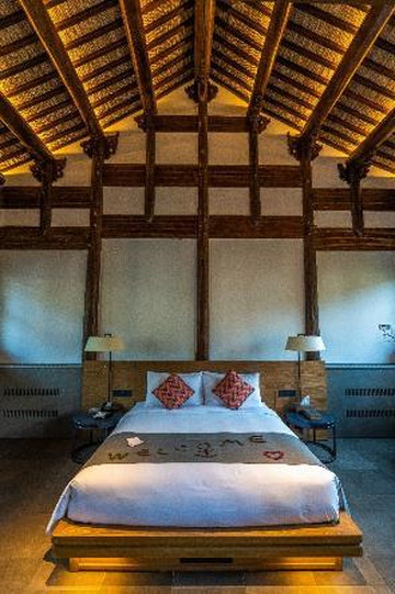 客房挑高的设计使房间显得宽敞透亮,即使是老宅,也不会显得阴暗压抑。晚上躺在床上,望着高高的房梁,还真感觉自己要穿越到几百年前,宛如成了将军府内的大家闺秀了。