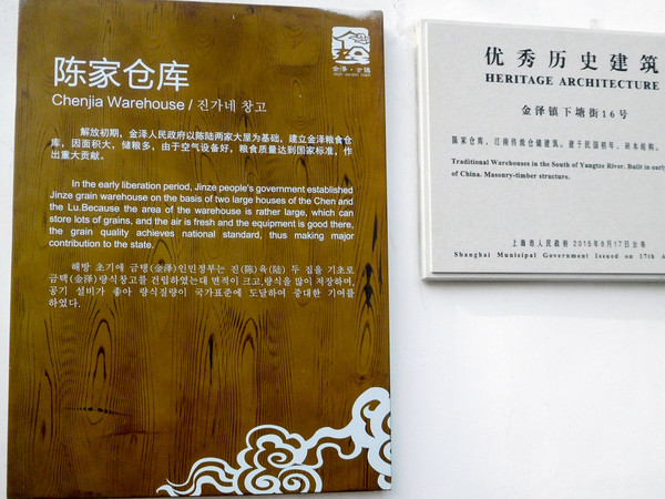 陈家仓庫。房屋建于民国初年,坐西朝东,砖木结构,总面积为175平方米。解放初期,金泽人民政府以陈、陆两家大屋为基础,建立金泽粮食仓库,因此地面积大,空气设备条件好,储粮多,粮食质量达到国家标准,为国家作出重大贡献。