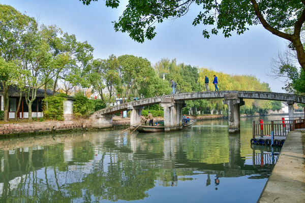 一直走就能见到一座座风格各异的古桥,走累了还可以坐上摇橹船欣赏古镇