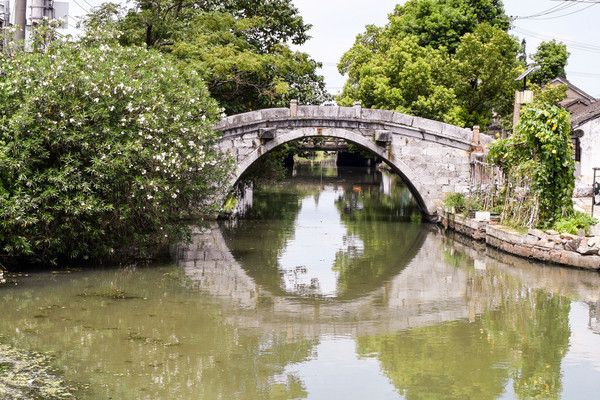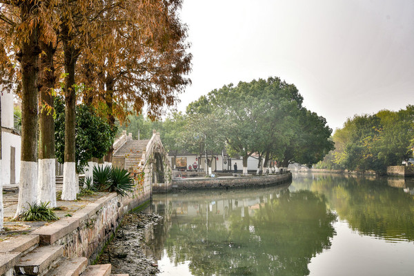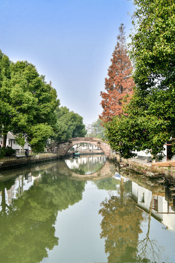如意桥桥拱倒映碧水,桥拱与倒影虚实相接,恰成一圆形,堪称是金泽镇的一大名胜。