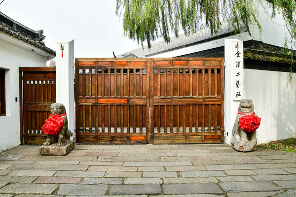 金泽工艺社,占地七十余亩,在几个废旧工厂的基础上,历经十多年的改造、建设,已经拥有包括若干个仿古建筑与陈设风格的故居、会所。这里原来是一片废旧的工厂区,占地面积颇大,上海金泽工艺社社长梅冰巧(香港人)女士花费十多年时光,逐间楼房改造拆建,打造出这个古典庭院。而今呈现在眼前的一切,是如此优雅精致又深具艺术内涵。