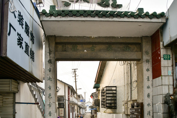 市河以东为上塘街,市河以西为下塘街。此为古镇金溪路上塘街入口处门楼:匾额~幽巷古肆,楹联:家乡水景水秀水清,古镇古迹古色古香。