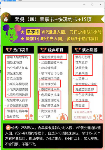 1)早享卡还是很有必要的,早一小时入园,很多热门项目可以提前刷,因为我们只订了一天的票,想尽量所有好玩的项目都能刷到,所以提前在淘宝买了早享套餐,可以有导游带着玩,安排最好玩的路线。