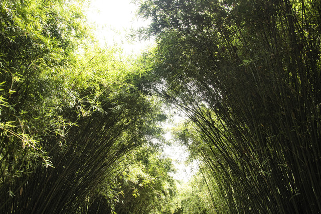 清晨,明媚的阳光穿过树林,形成了一道道美丽的“光柱”。