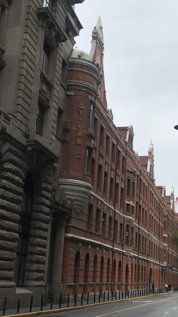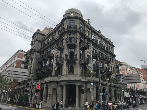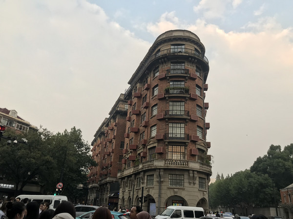 路口的武康大楼是武康路的标志性建筑,是拍照打卡的热门。我们从路口几个方向不同角度,围着武康大楼拍了一圈,又走进一层的长廊,仔细欣赏这一历史名建。外立面的红色墙体,三角形的窗楣,铁栅栏的小阳台,浓郁的法国文艺复兴风格;大楼底层为东南亚风格常见的骑楼样式,长廊可以行走,开了一些小商铺;整体造型宛如一艘等待起航的巨大游轮。