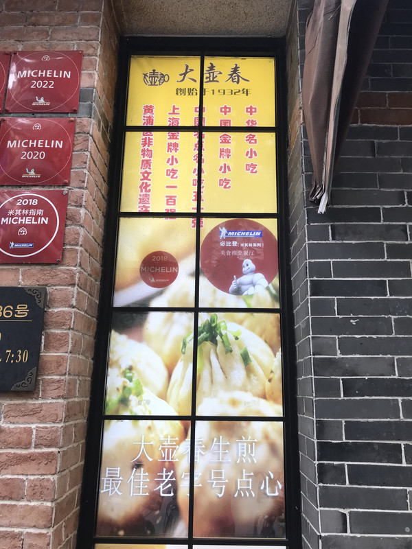 进入酒店,一股幽幽的香气迎面扑来,带来心情的愉悦和放松。我们放下行囊,走出酒店,先解决午餐问题。闺蜜力荐的大壶春生煎就在酒店附近。我们走过去已经是下午一点多了,餐馆三三两两仍坐了不少食客。我们把三种经典的馅料各点了一份:鲜肉、大虾和蟹粉。蘸一点点醋,外皮焦黄酥脆而不硬,馅料鲜美充足而不腻。回来后,我和老公这样评价:这是我吃过的最好的生煎包。而且,经济实惠,价位绝对亲民。刚才嘴急,吃完出门细看,才发现人家挂在门口的众多荣誉:中华名小吃、中国金牌小吃、黄浦区非物质文化遗产、上海金牌小吃一百强、米其林上榜、点评上榜,满满挂了一墙。