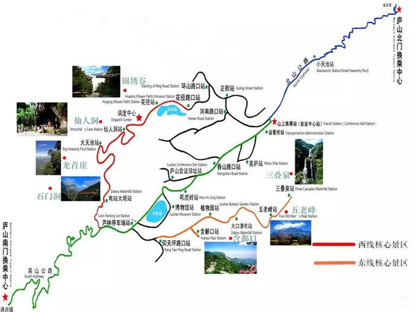如琴湖→花径→锦绣谷→仙人洞→大天池→龙首崖→美庐或老别墅的故事→ 庐山 会议旧址→三宝树→ 黄龙寺→黄龙潭→乌龙潭