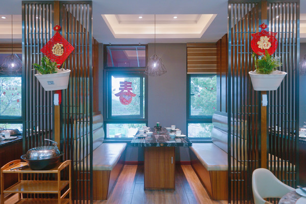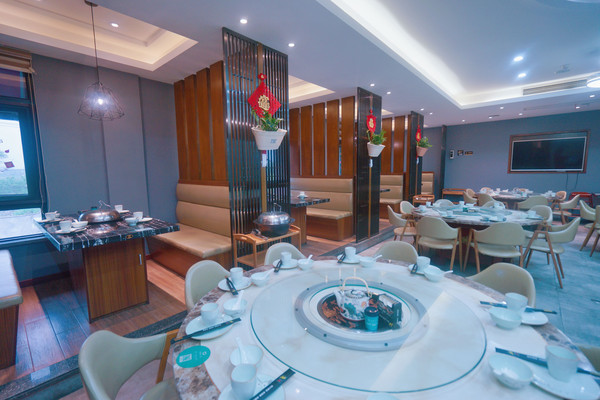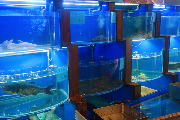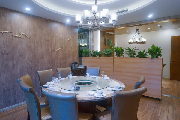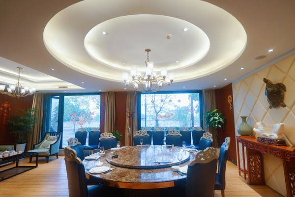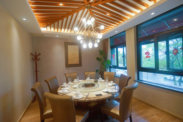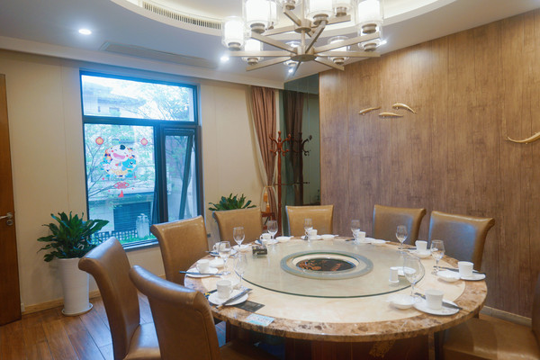 两层楼的沿街门面餐厅,一进门左手边墙上介绍餐厅两位厨师的工作经历,以及收银台。右手边是养殖海鲜区域。一楼有2间包房,其中沿街有窗的包房可12-16人同时用餐,是餐厅最大的一间包房。二楼有三间包房,以及半开放式火车头位置都是靠窗的,中间是圆桌位置。
