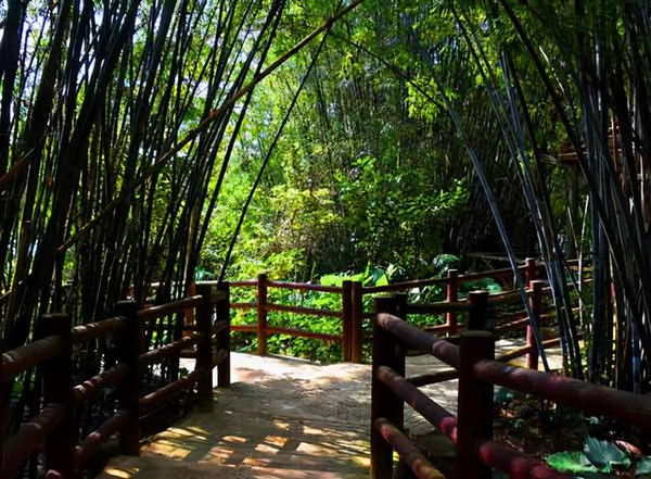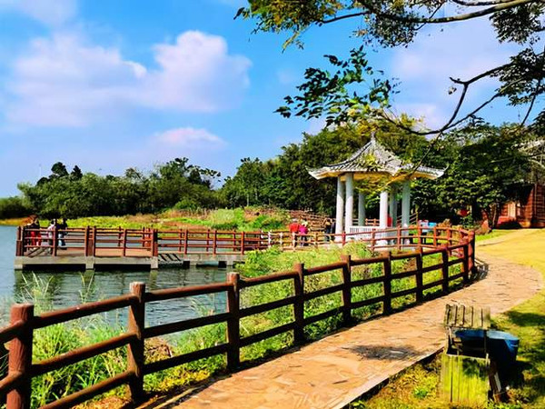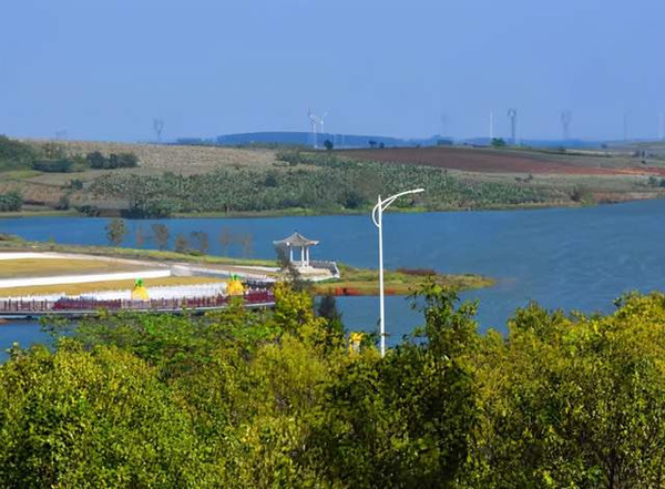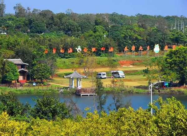 当你走进菠萝的海景区,顺着木质的观光栈道,穿过竹林与椰树来到栈道尽头,就能看到一片湖光山色的景象。在水畔的菠萝的海观景台上回望是绿茵茵的大草甸,在高耸的山坡上,几个“菠萝的海,香飘四海,长寿之乡,菠萝飘香”的红色大字异常醒目。