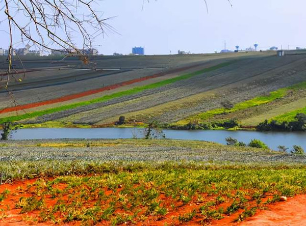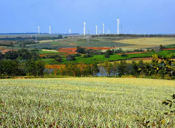 据说,如果从空中俯瞰,最能体现七彩田园的风光无限。只见“菠萝的海”大地曲线优美,起伏舒缓,田园一年四季色彩斑斓,与散落其间的村庄、巨大的白色大风车共同构成了一幅独具魅力的热带生态农业画卷。