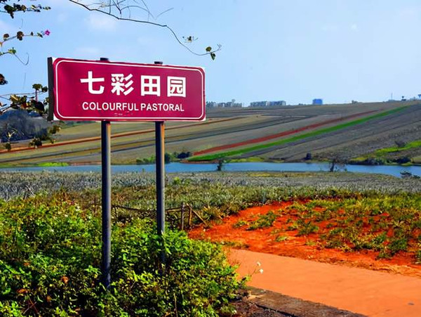 七彩田园是菠萝的海的著名景观之一。这里有最美的乡村、最美的地平线、最美的田园、最美的果蔬。这里位于一个高起的山坡上,环顾四周漫山遍野的种植的菠萝、凤梨分外壮观。在这里一个菠萝2.5元,一个凤梨3元一切两半穿在竹棍上品尝,一咬一股水,酸甜适中,十分爽口。