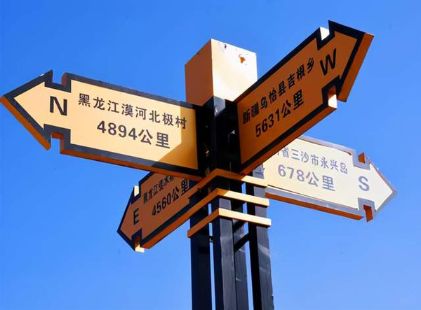 记者看着在灯角楼不远的地方看到一个醒目的路标,上面标着南极村与祖国四面八方极地的距离,上面分别有新疆乌恰县吉根乡、黑龙江北极村、黑龙江佳木斯乌苏镇、海南省三沙市永兴岛与此的距离为5631、4894、4560、678公里。