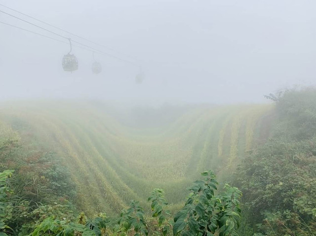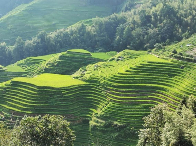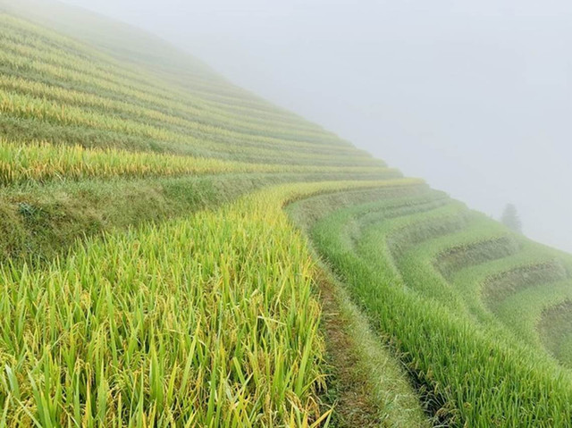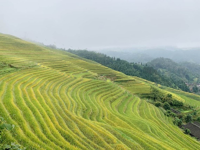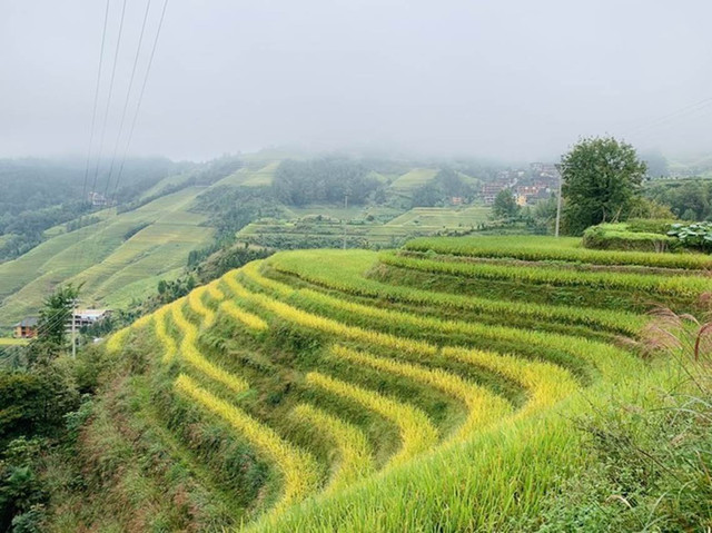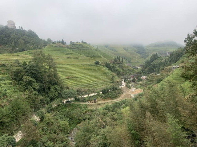 到了桂林当天我就预约了龙脊梯田。行程安排在了第四天。从市区往龙脊梯田开的路上风景也特别好。上山之后天气就冷了,于是就看到了大家穿上了风衣、羽绒服。