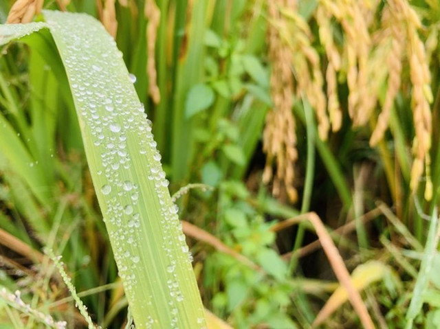 拍到了水稻的露水。这是第一次近距离看到水稻。我一直以为水稻是必须在水里面生长呢,一看这里也没那么多水方知道,原来是说水稻需要经常浇水。